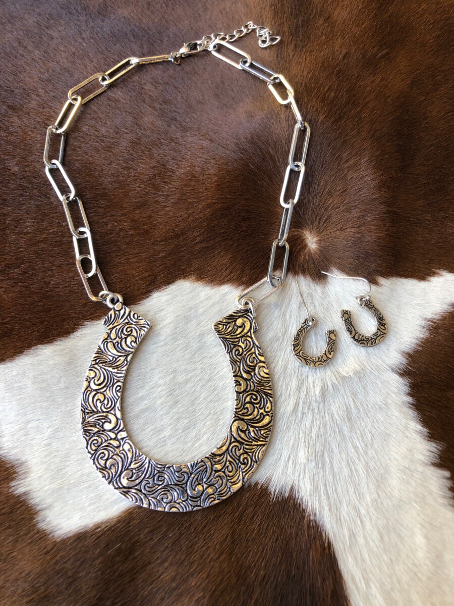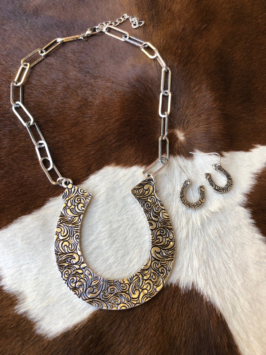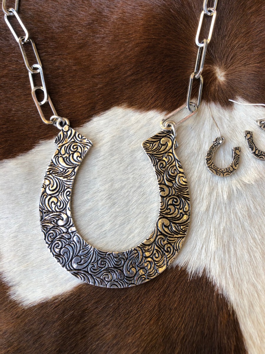 ” Ericka ” Large Western Horseshoe Necklace Set ( Silver )
