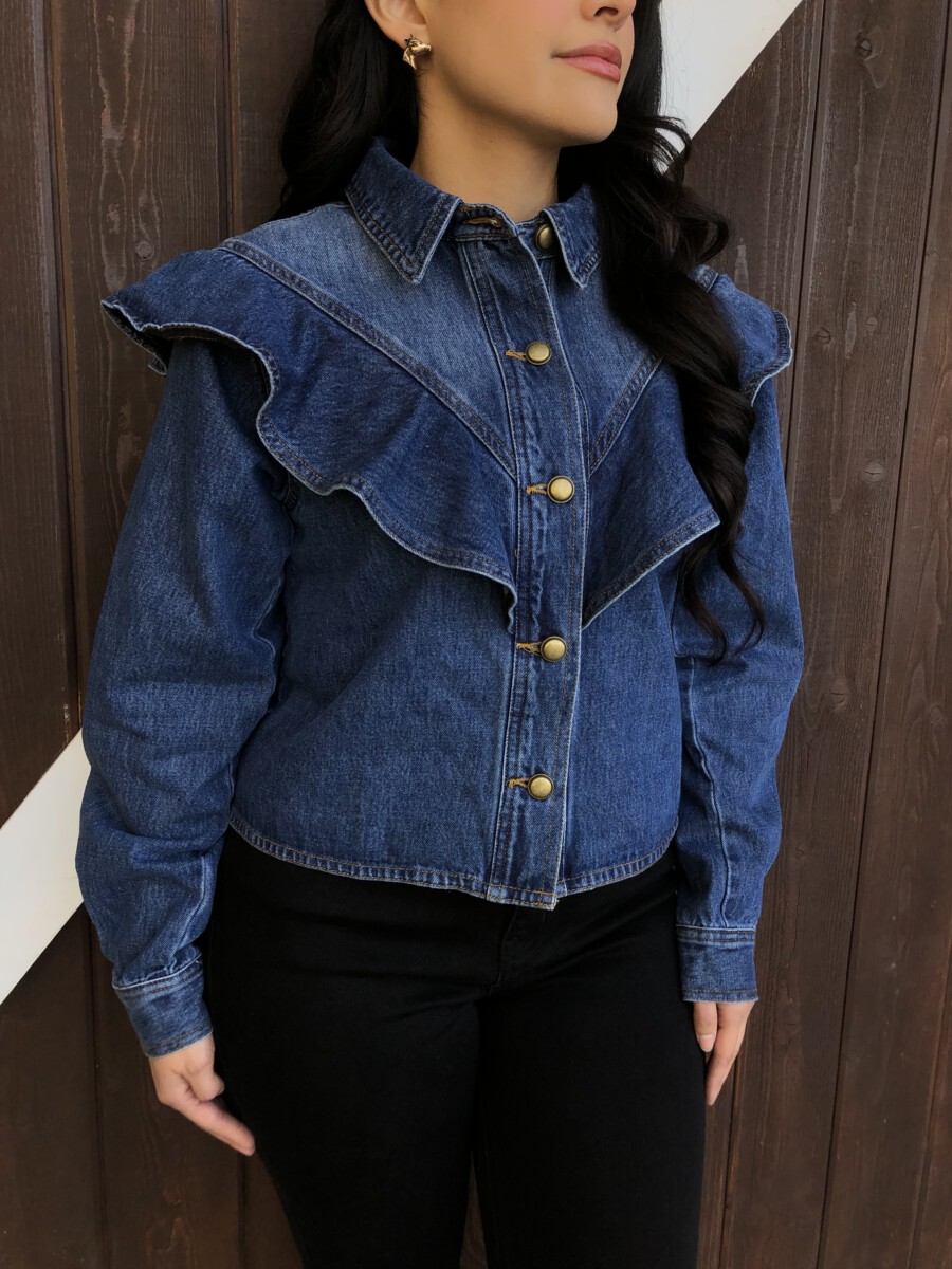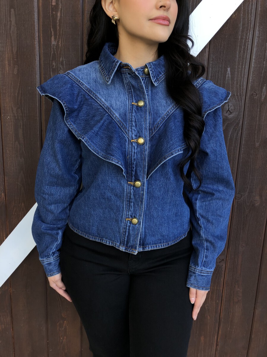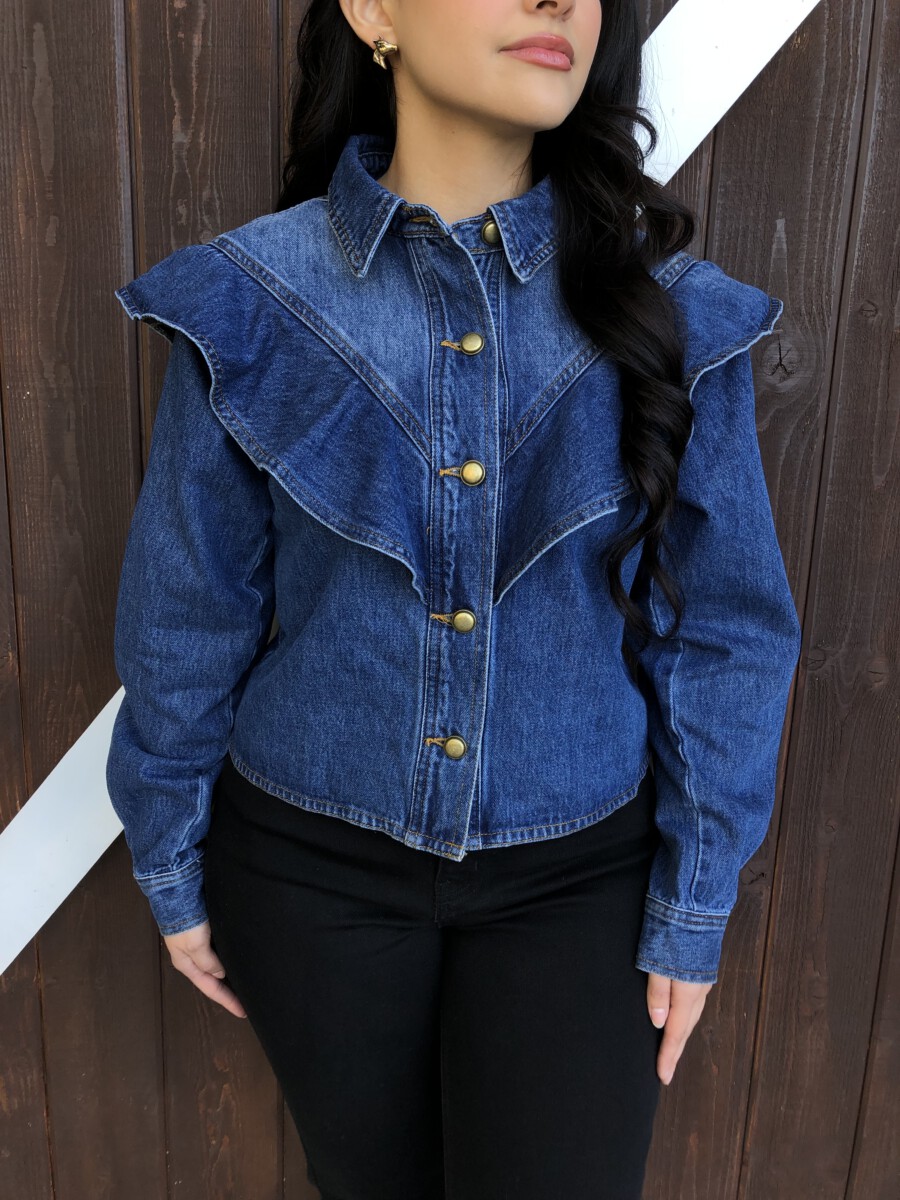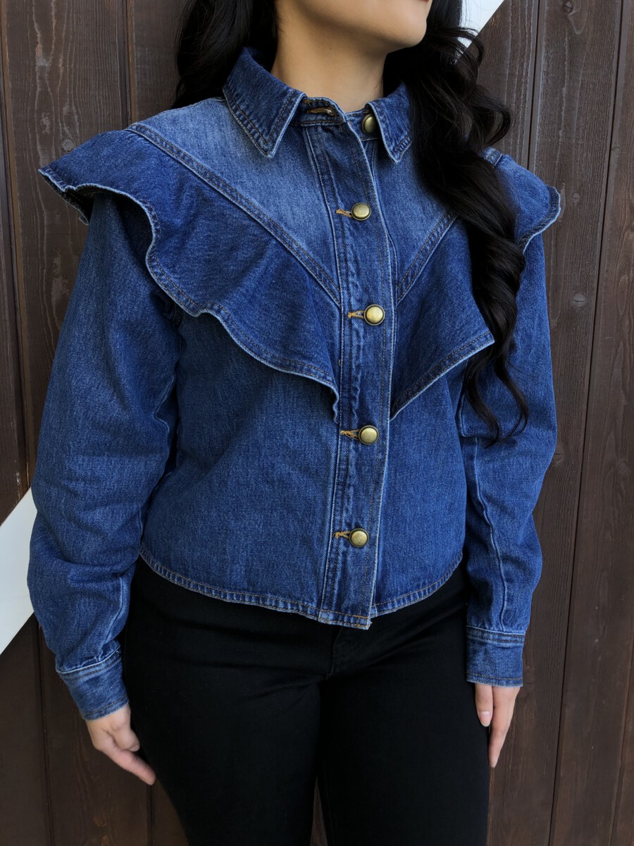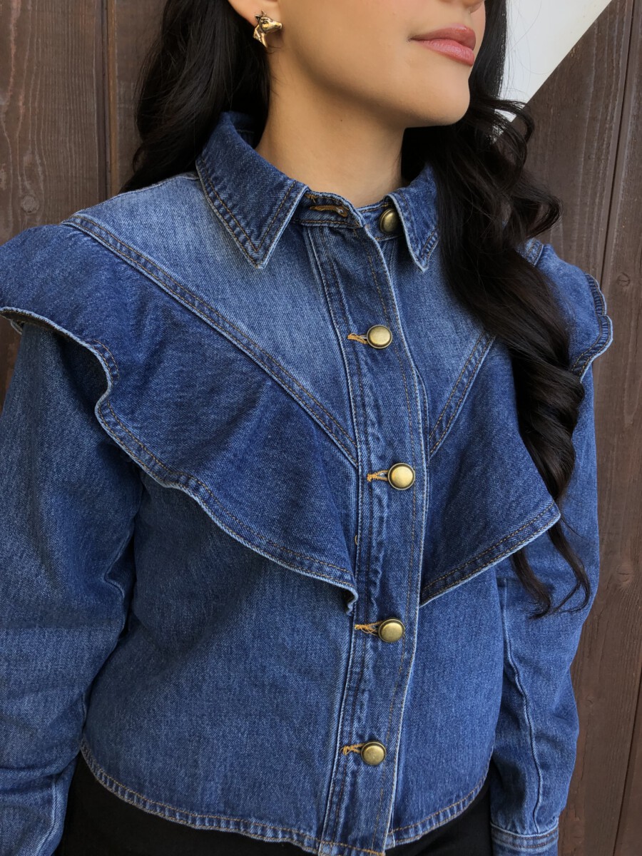 - Collared denim jacket with contrast panel yoke, asymmetric ruffle trim, and gold-tone button closure for