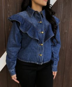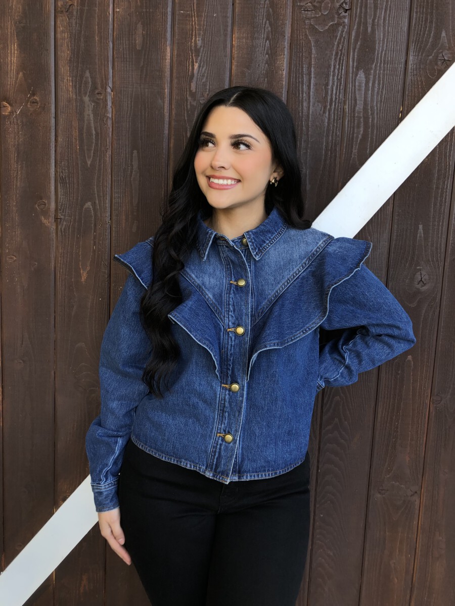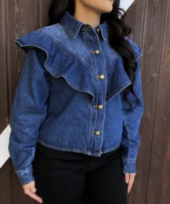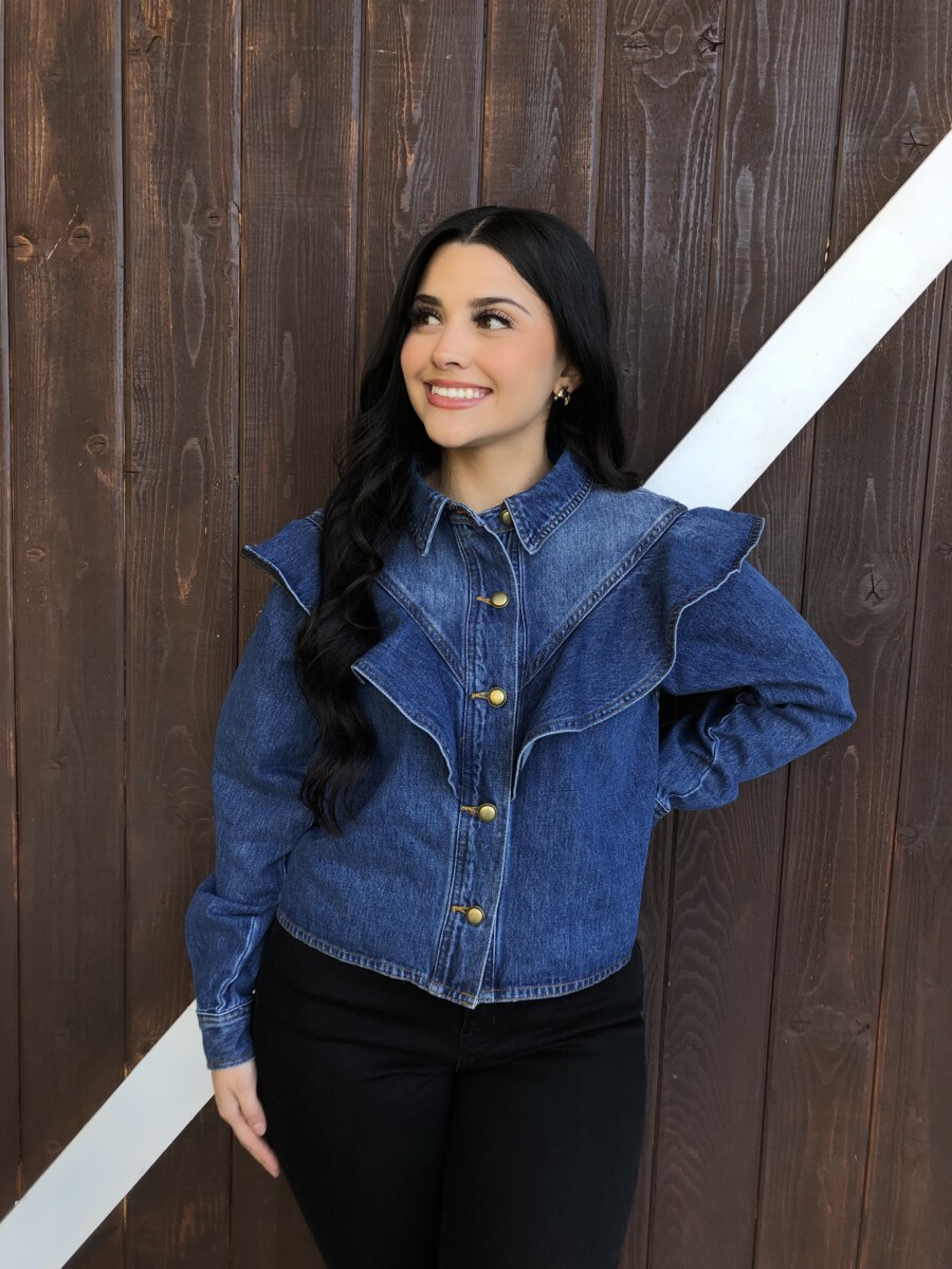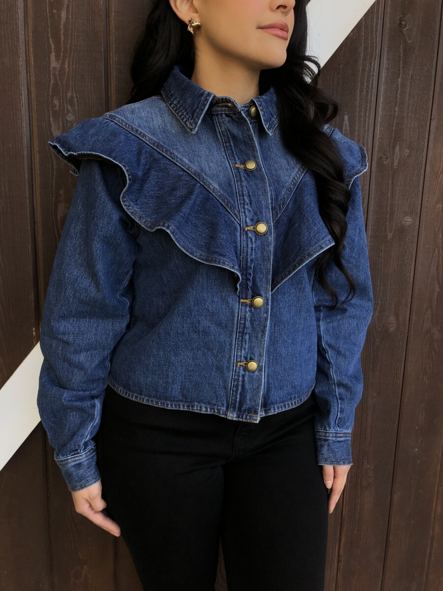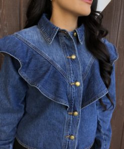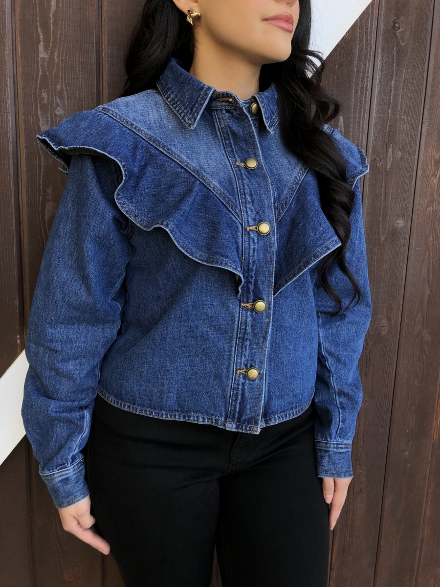 - Collared denim jacket with contrast panel yoke, asymmetric ruffle trim, and gold-tone button closure for