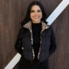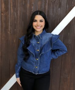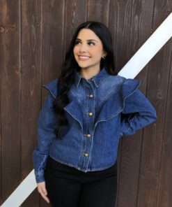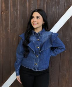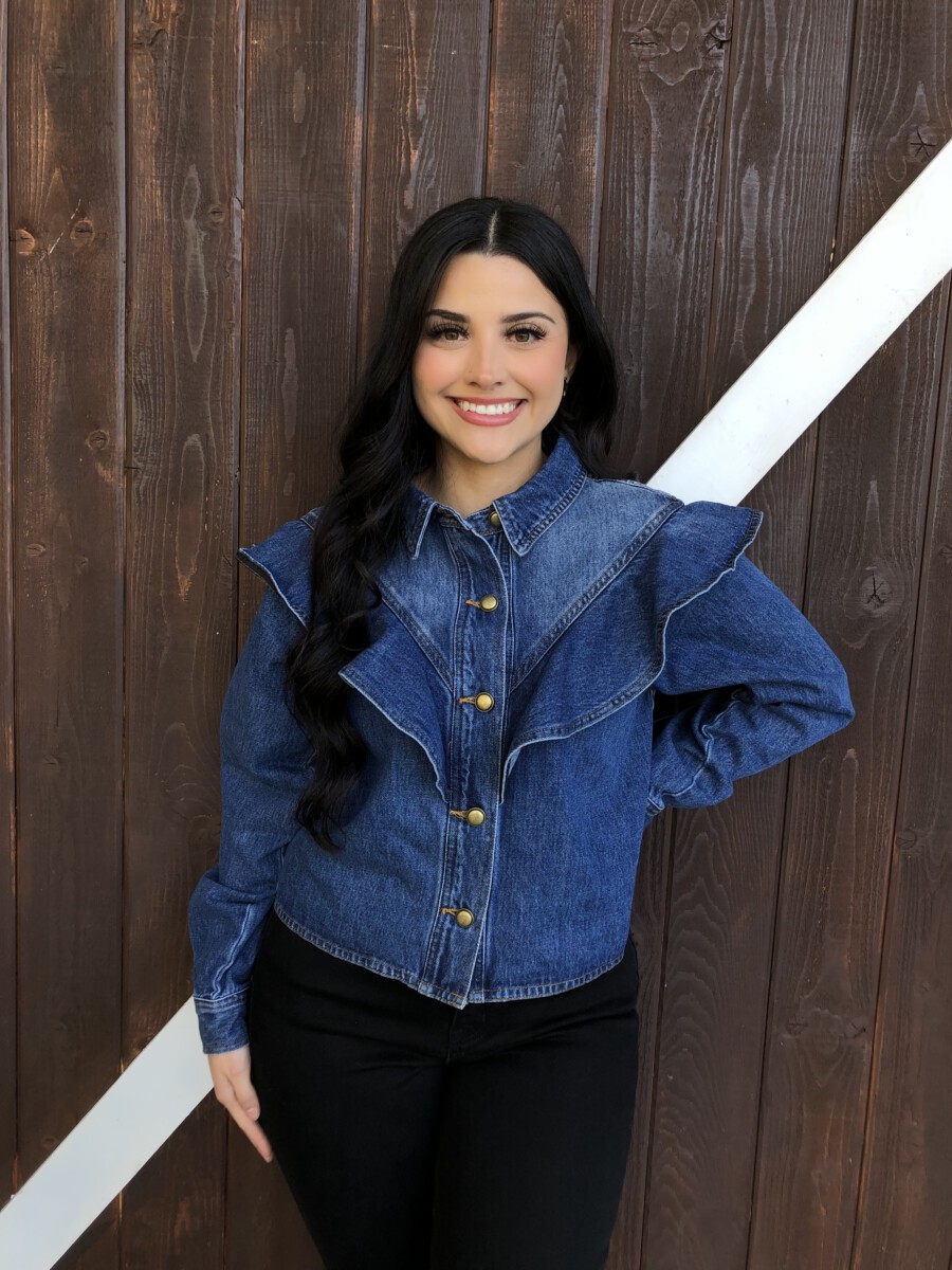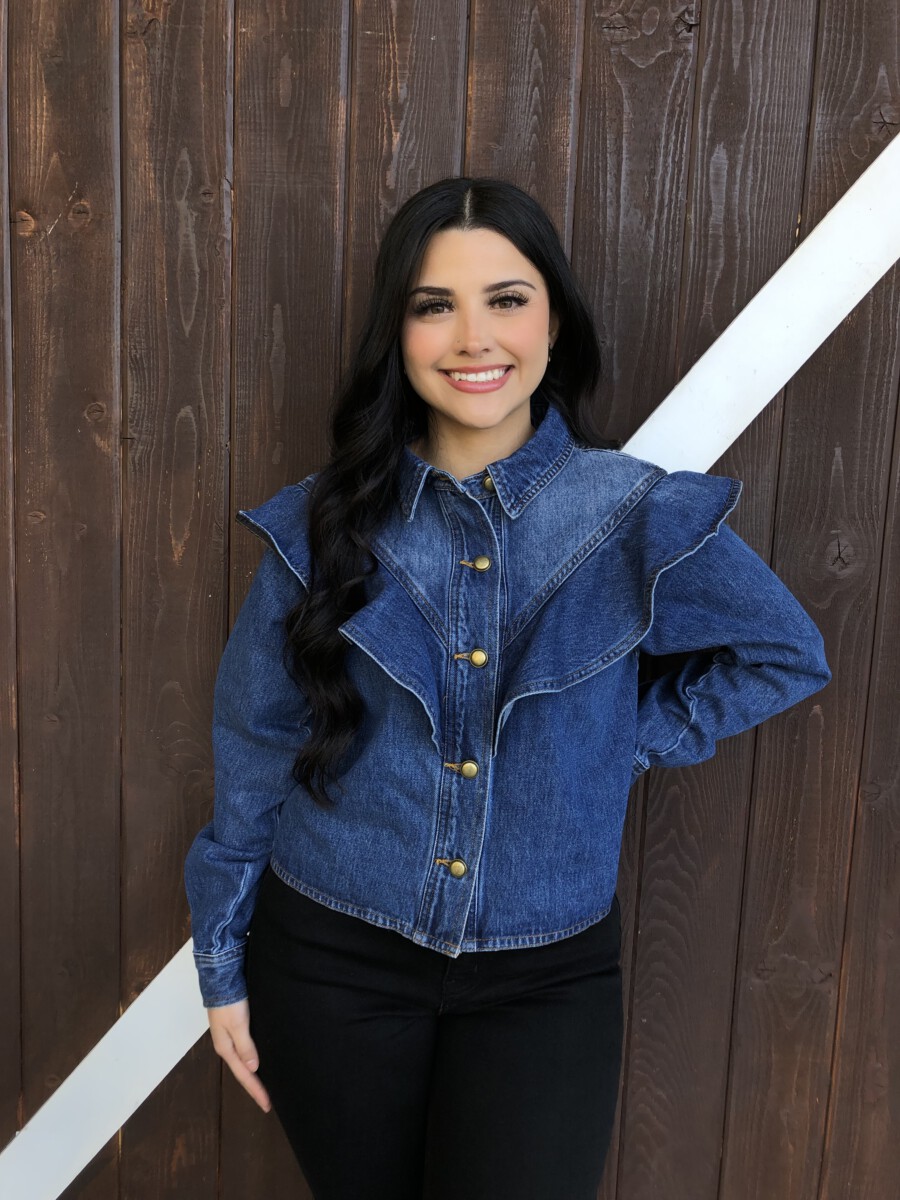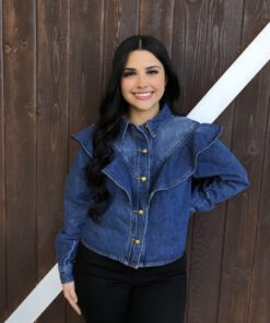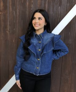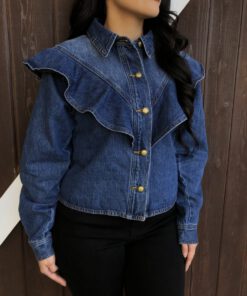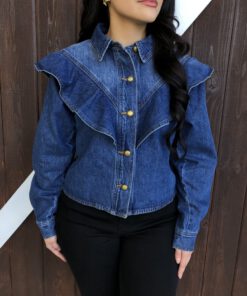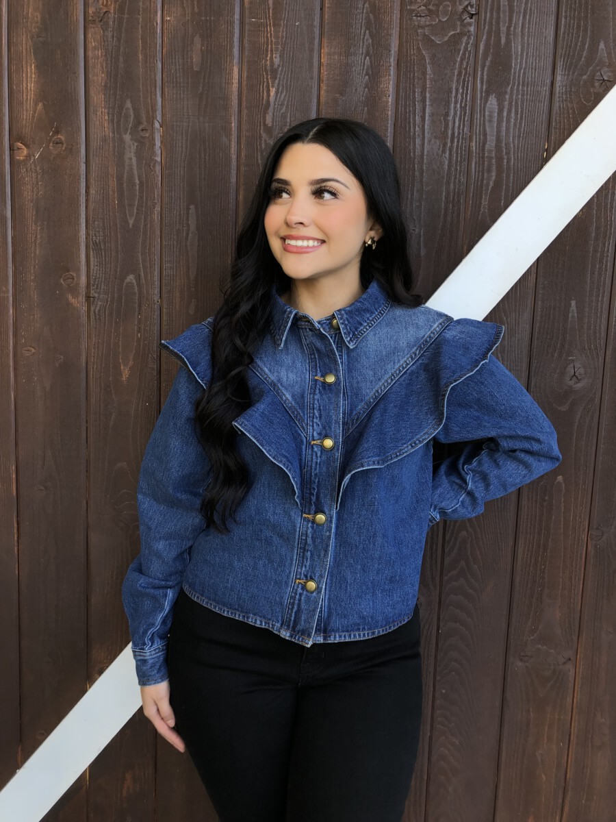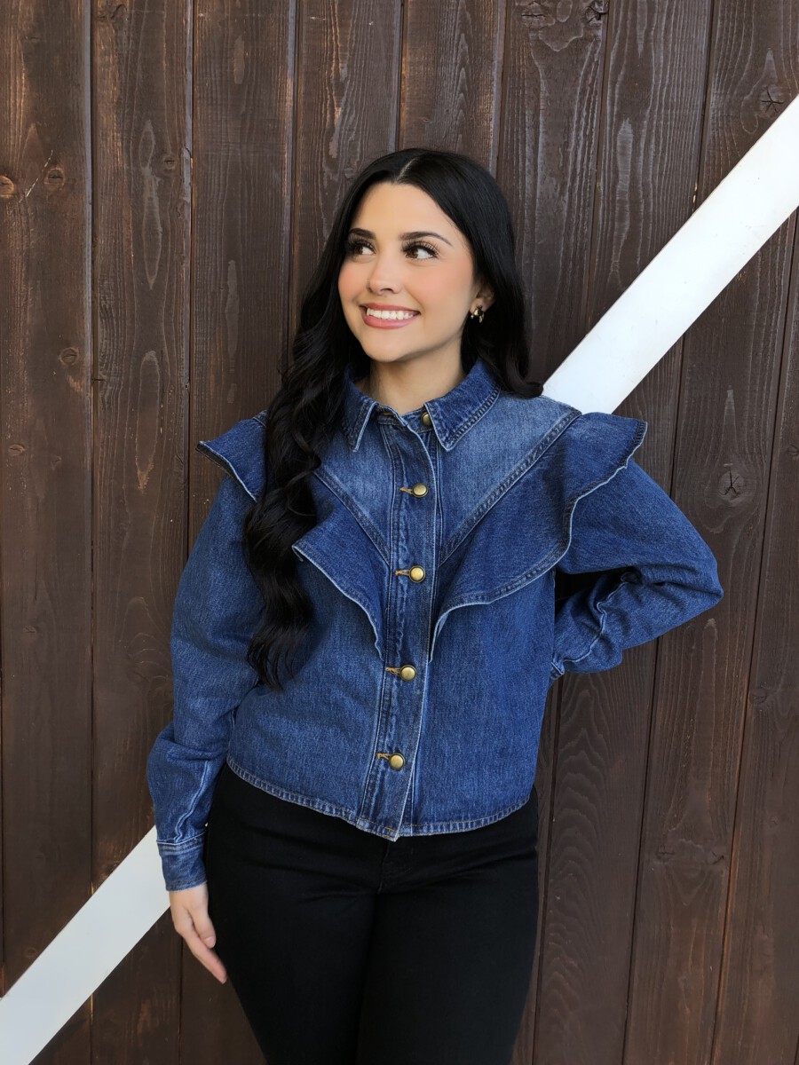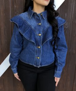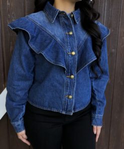 - Collared denim jacket with contrast panel yoke, asymmetric ruffle trim, and gold-tone button closure for