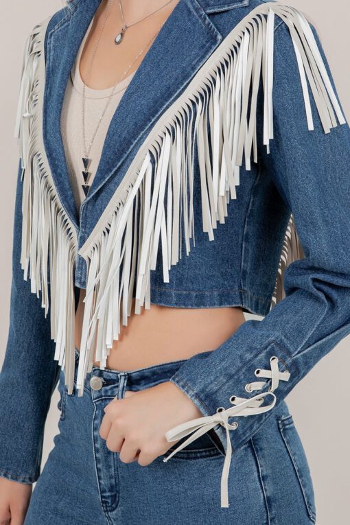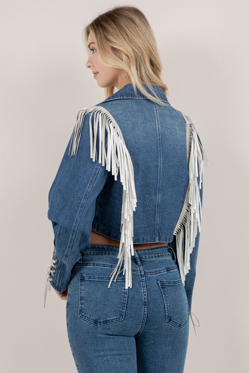 ” Brownyn ” Fringed Cropped Denim Jacket ( Medium Wash )
