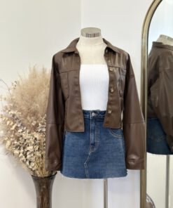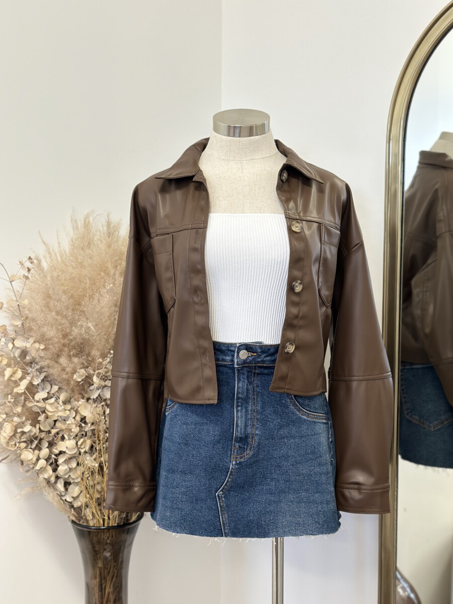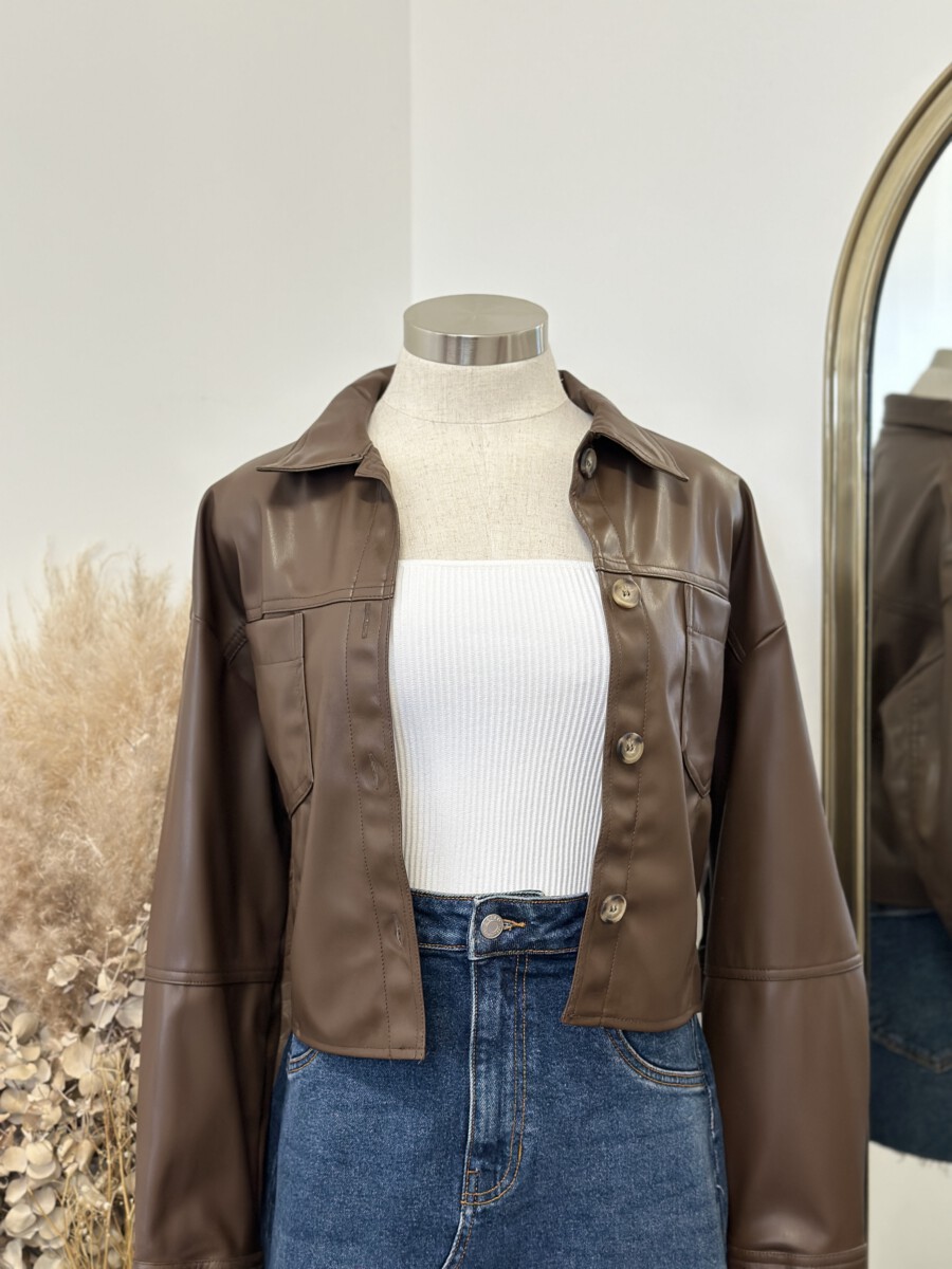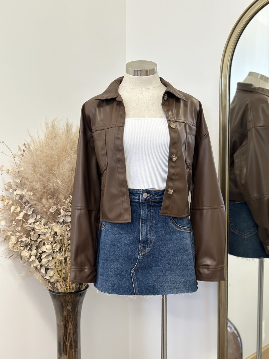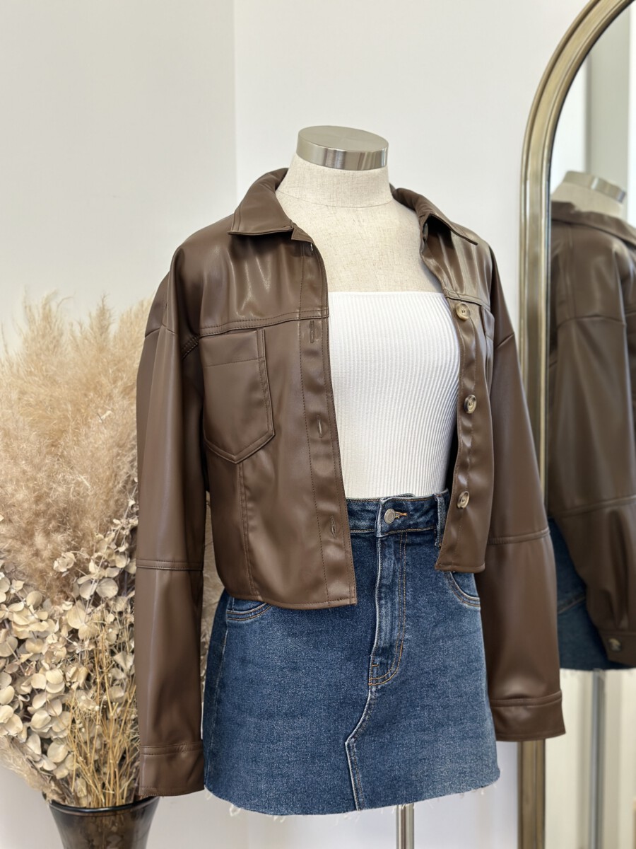 ” Chrishell ” Pu Faux Leather Cropped Jacket ( Brown )