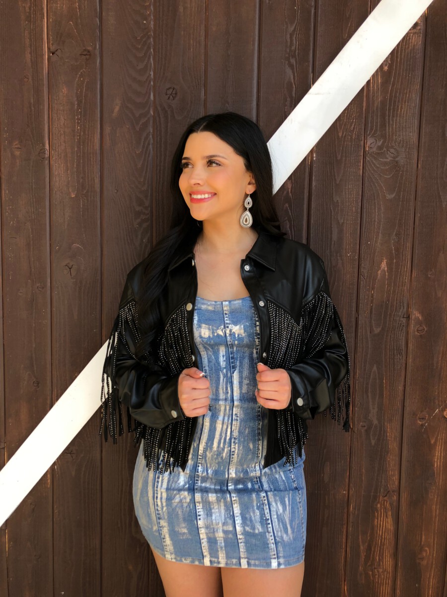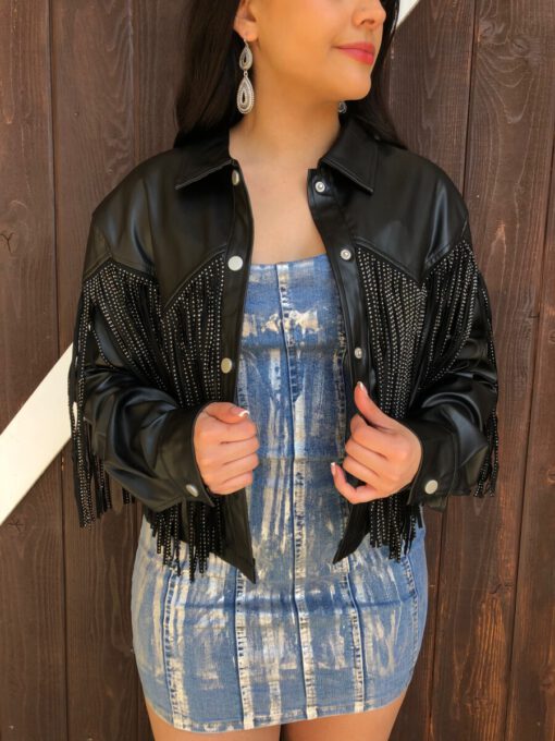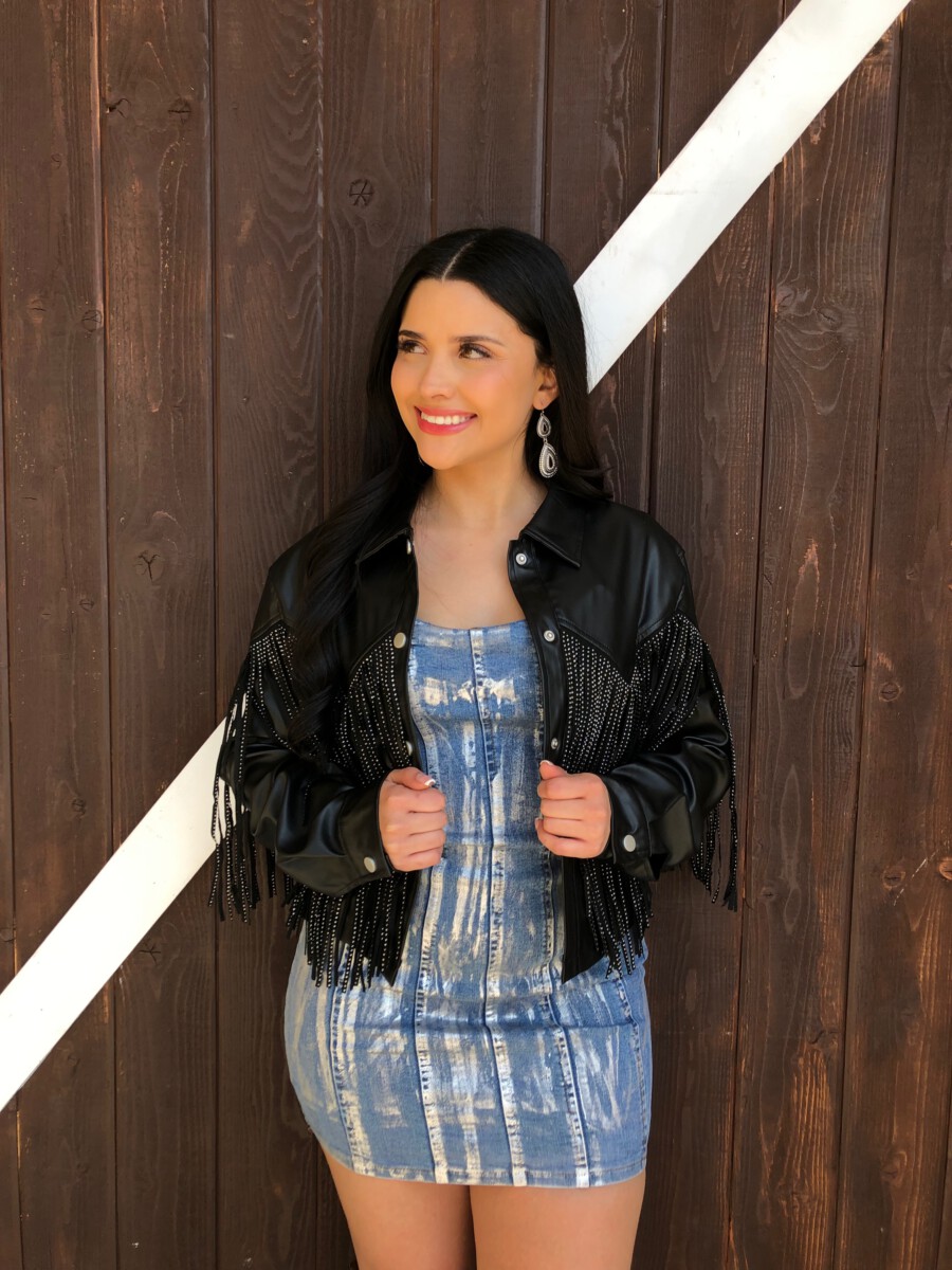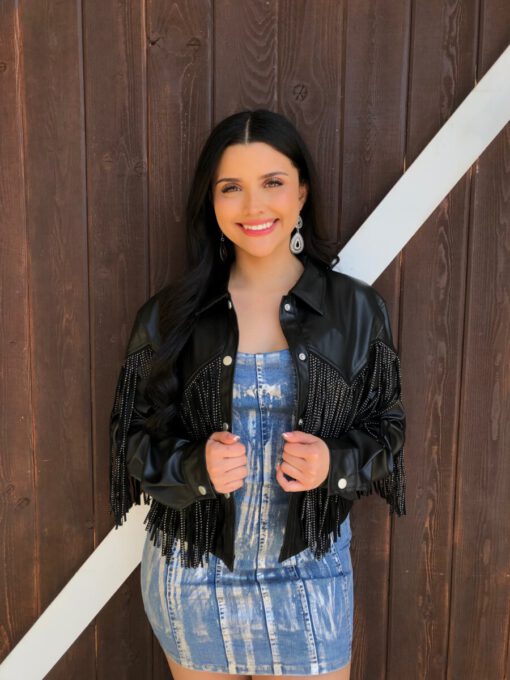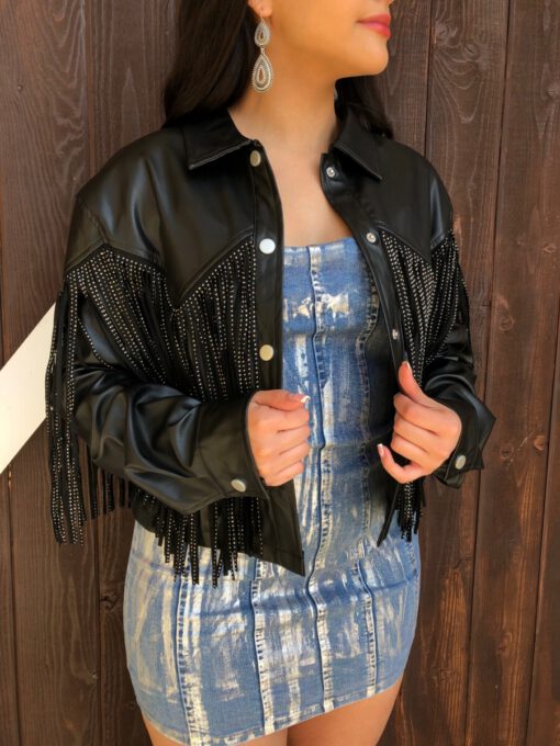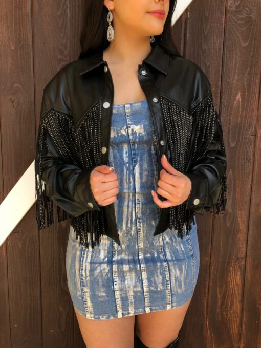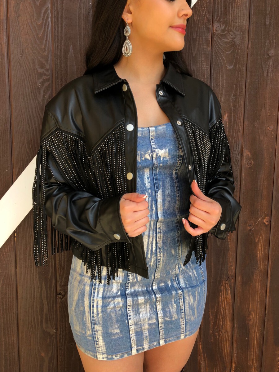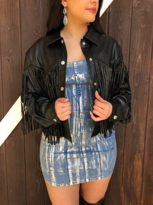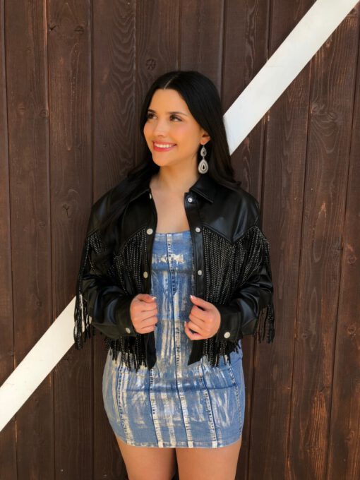 ” Jade ” Pu Faux Leather Fringe Jacket ( Black )