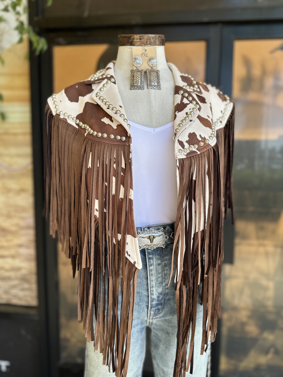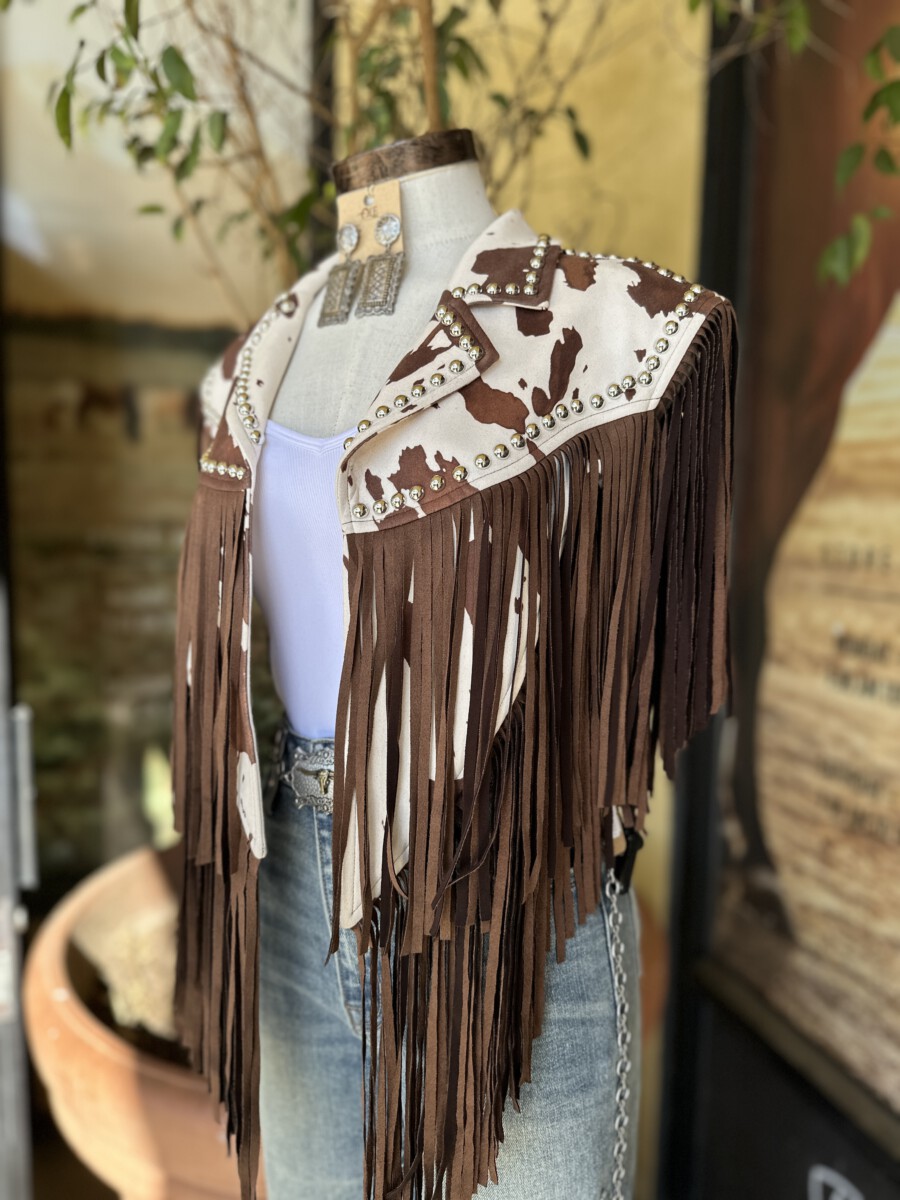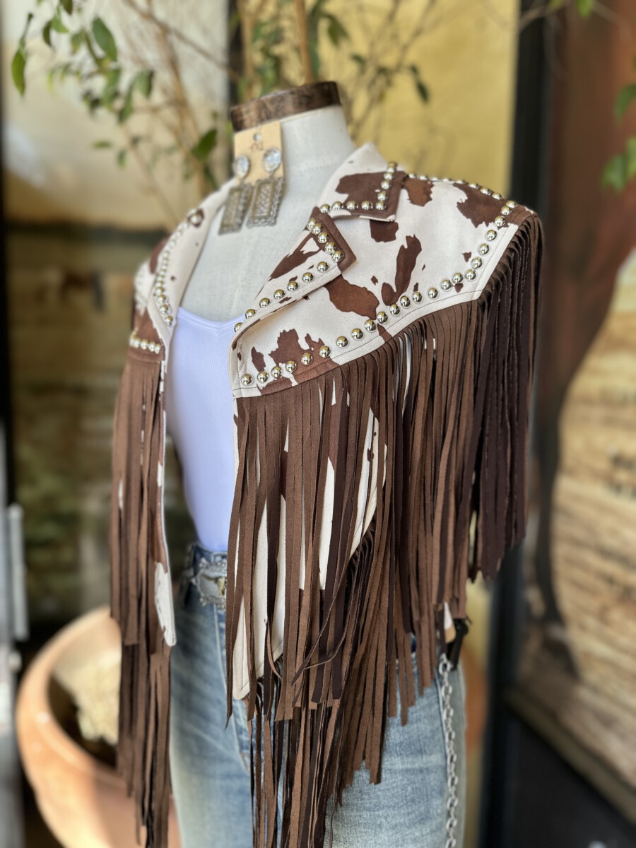 ” Kiara ” Cow Print Studed Fringe Shrug ( Brown )