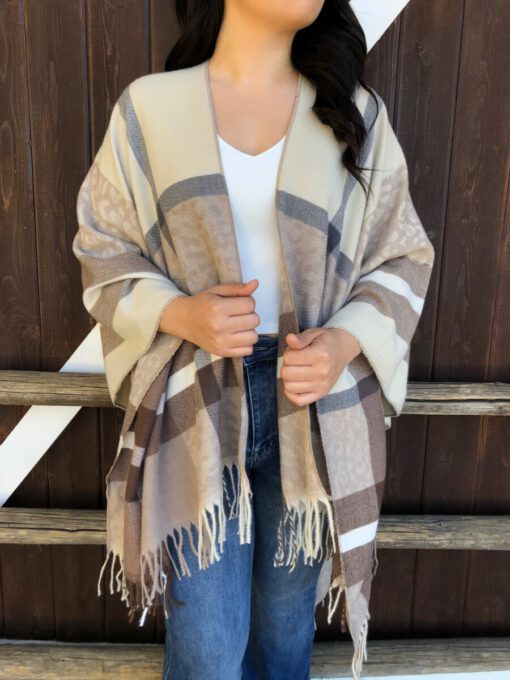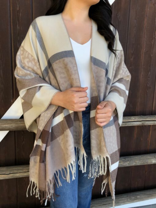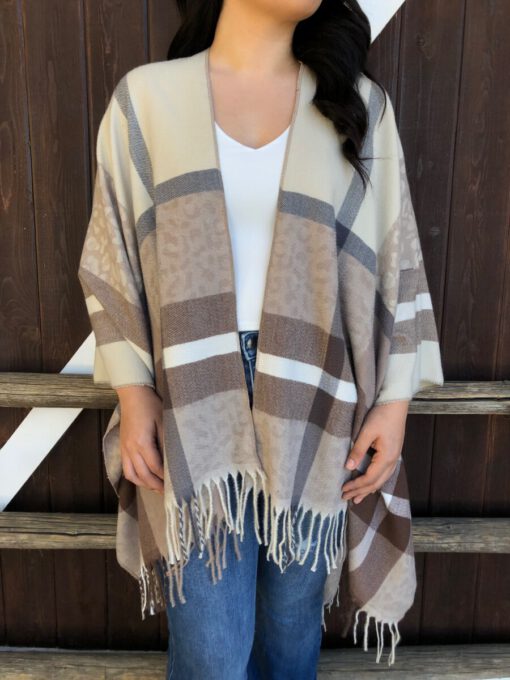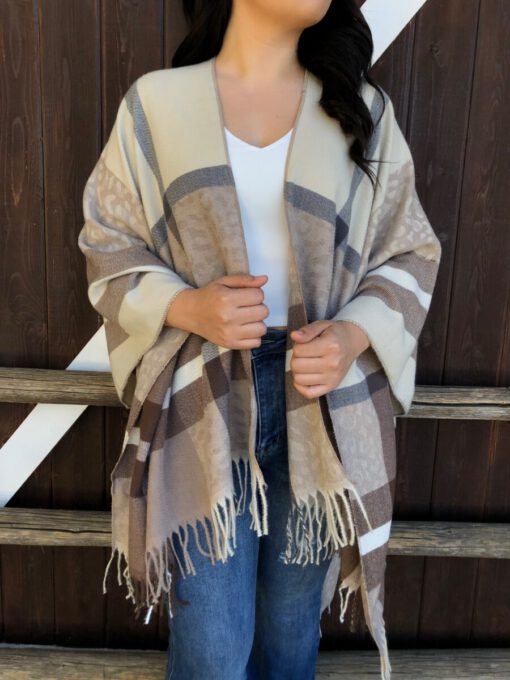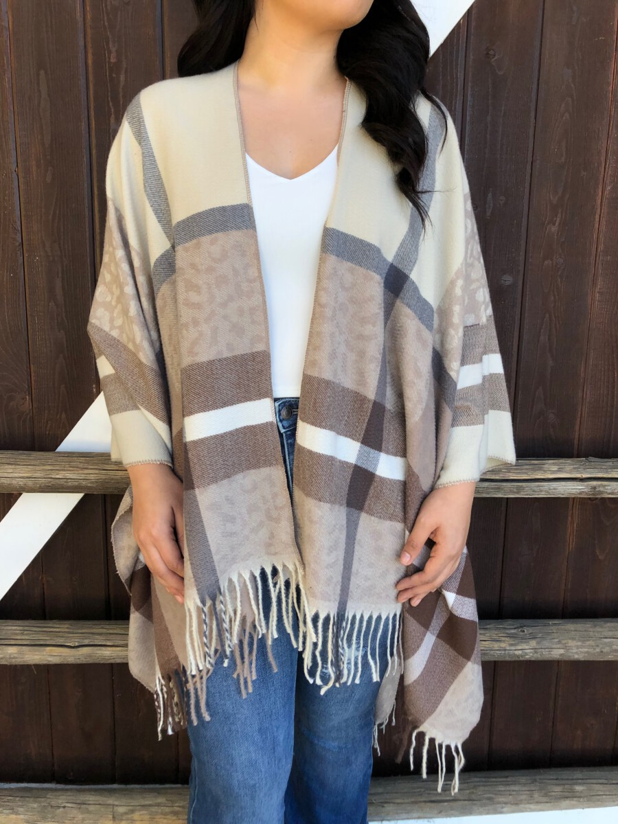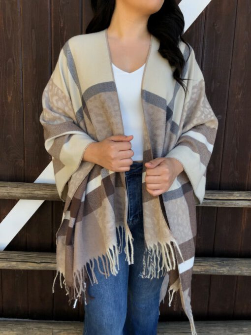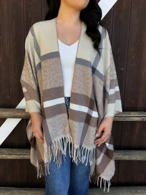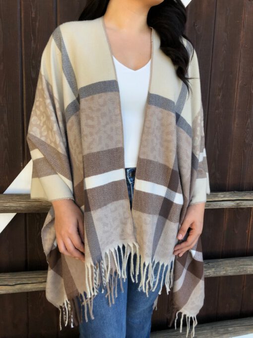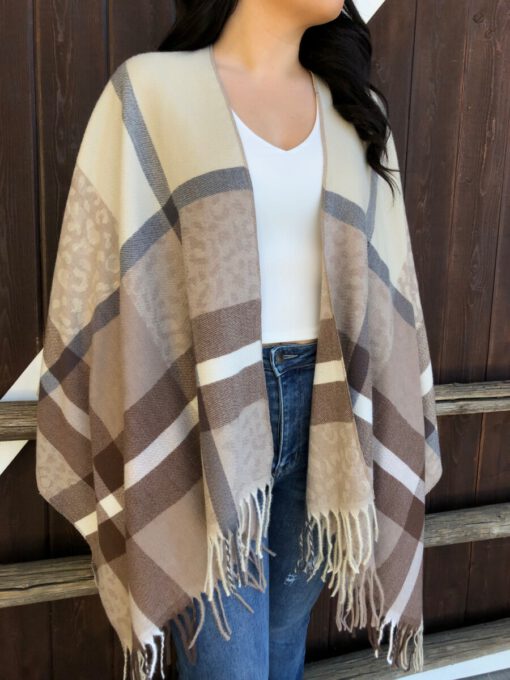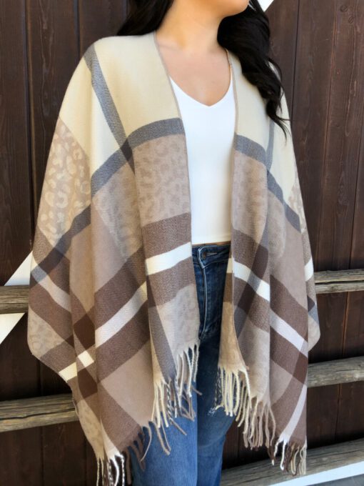 ” Cassandra ” Plaid & Leopard Fashion Cape ( Taupe )