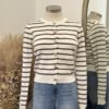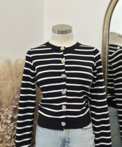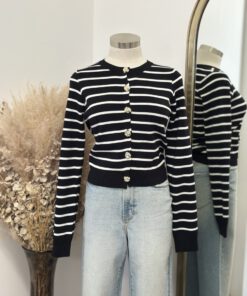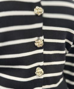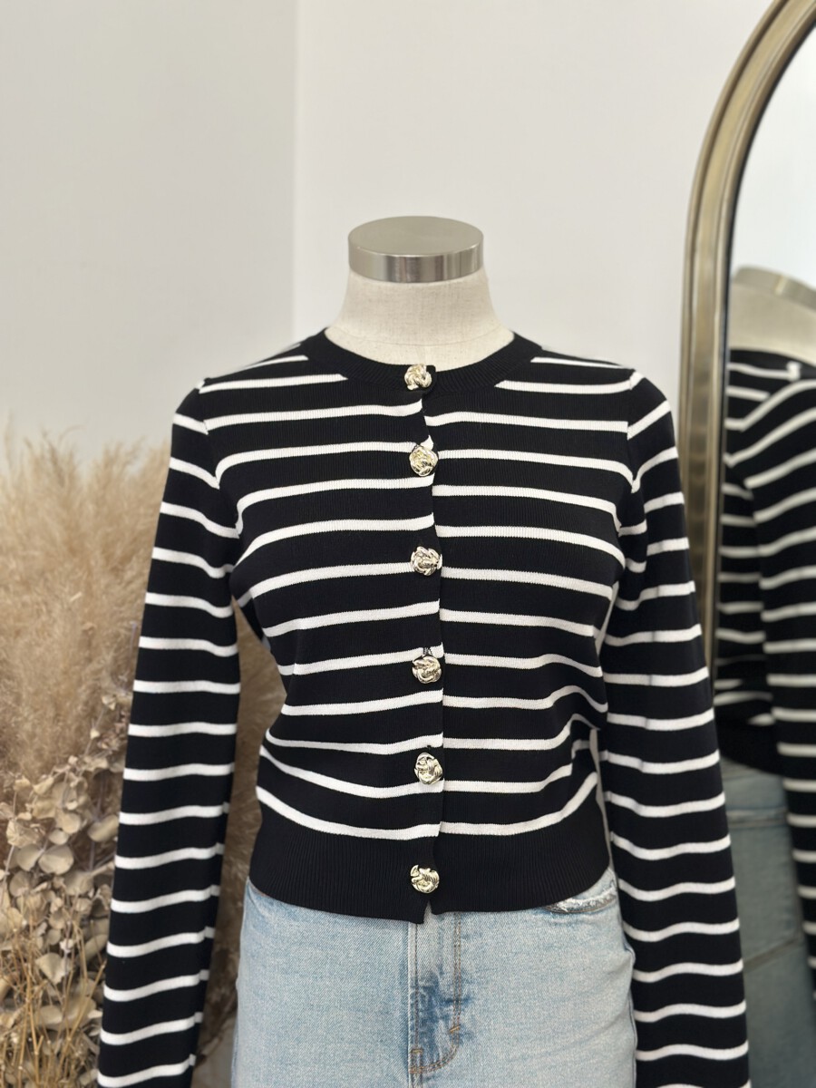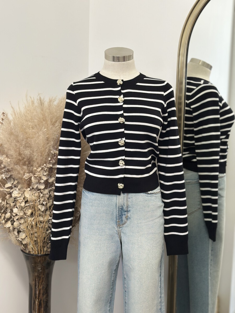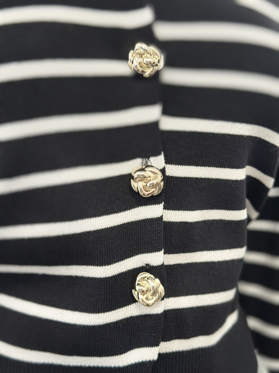 FEATURES - Crew Neck, Button Front Closure, Long Sleeve & Gold Floral Buttons - Model is Wearing Size Small