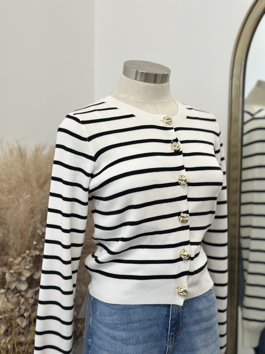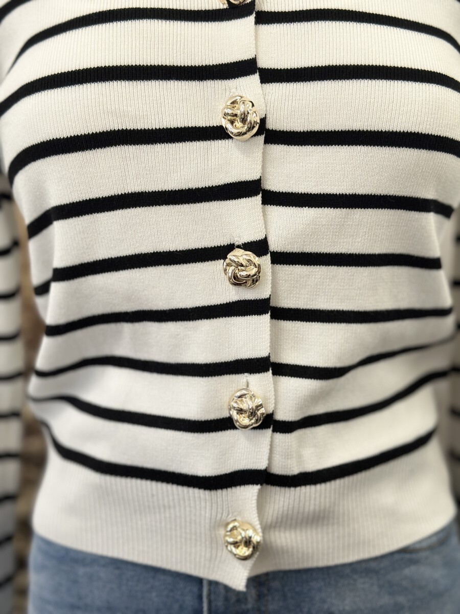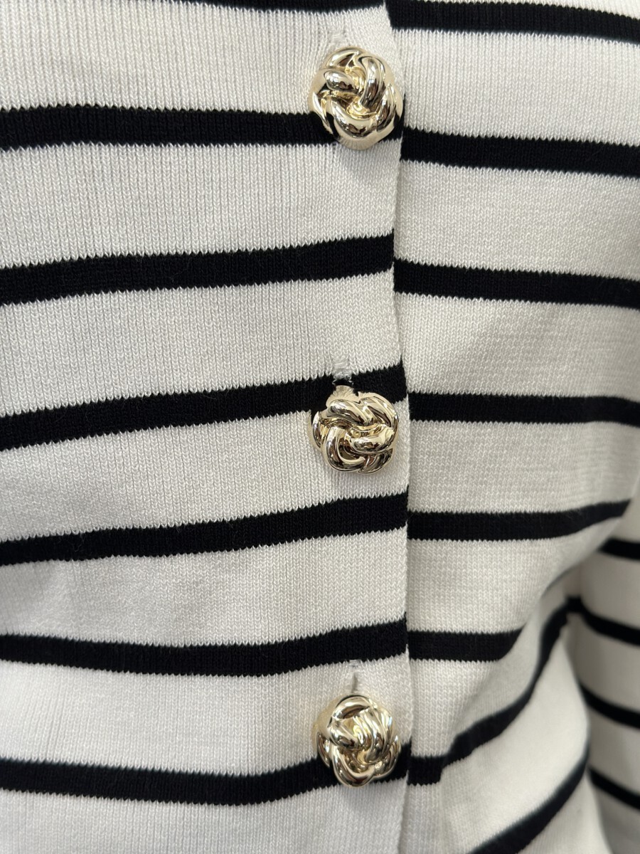 ” Elisandra ” Striped Cardigan W/gold Floral Button ( White / Black )