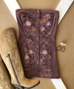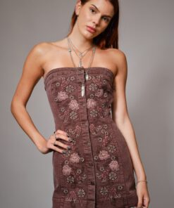 ” Arizona ” Embroidered Button Up Tube Denim Dress ( Washed Plum )