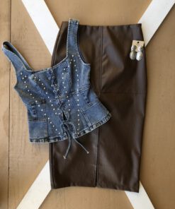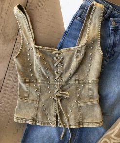 ” Montana ” Square Neck Metal Studs Lace-up Denim Top ( Camel )